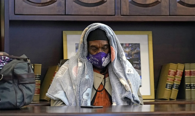Một người đàn ông đội khăn trên đầu để giữ ấm trong cửa hàng đồ nội thất được dùng làm nơi trú ẩn cho những người bị mất điện ở Houston, Texas, ngày 17/2. Ảnh: AP.