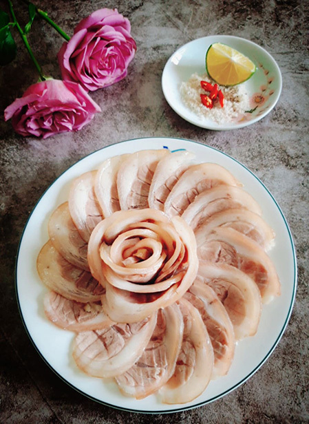 c) Trình bày và thưởng thức: Dùng dao sắc thái thịt chân giò mỏng theo khoanh và xếp tròn lên đĩa rồi thưởng thức. Từng miếng thịt chân giò thơm ngon, da giòn, bên trong thịt mềm ngọt, trắng hấp dẫn. Món này chấm với muối chanh hoặc mắm tôm, mắm tép đều rất ngon!