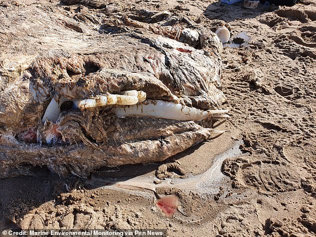 Các bức ảnh chụp tại hiện trường cho thấy xác quái vật biển đang phân hủy nặng. Những gì còn lại là lớp da màu xám, lộ phần xương ở một số bộ phận.