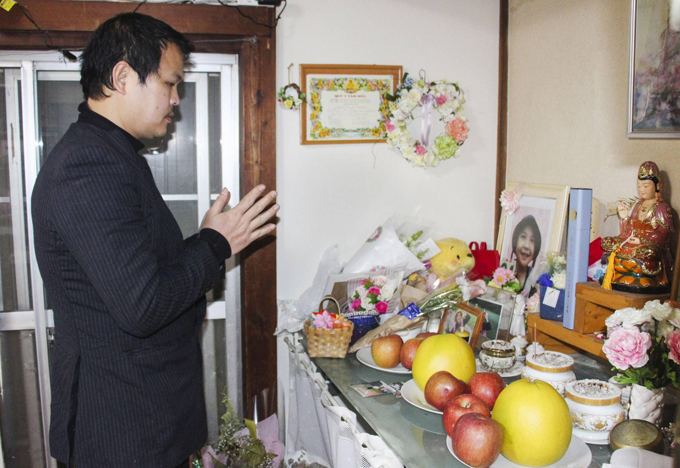 Anh Hào cầu nguyện trước di ảnh con gái Nhật Linh hôm 20/3 trước khi dự phiên tòa xét xử hôm nay. Ảnh: Kyodo.