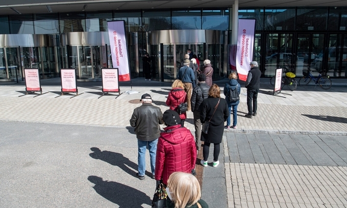 Người dân Thụy Điển xếp hàng chờ tiêm vaccine Covid-19 tại Stockholm hôm 8/4. Ảnh: AFP.