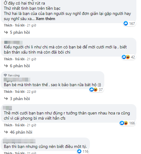 Chưa kể, nhiều khi bạn thân có chồng con thì dắt hết cả gia đình theo ngồi đầy một bàn nhưng bỏ phong bì ít tiền. Điều này khiến các nàng dâu không vui, viết bài bốc phốt bạn trên mạng xã hội.