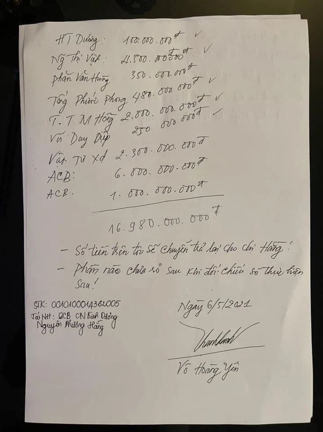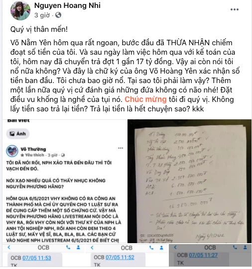 Đính kèm bài viết là những tin nhắn chuyển tiền với số tiền từ 250 triệu đồng đến 6 tỷ đồng có nội dung chuyển như "Võ Hoàng Yên trả tiền mượn chị Hằng". Không chỉ vậy, tài khoản này còn chụp 1 tờ giấy viết tay được cho là giấy xác nhận nợ tiền mà ông Võ Hoàng Yên xác nhận số nợ gần 17 tỷ đồng, được ký, ghi ngày 6/5/2021.
