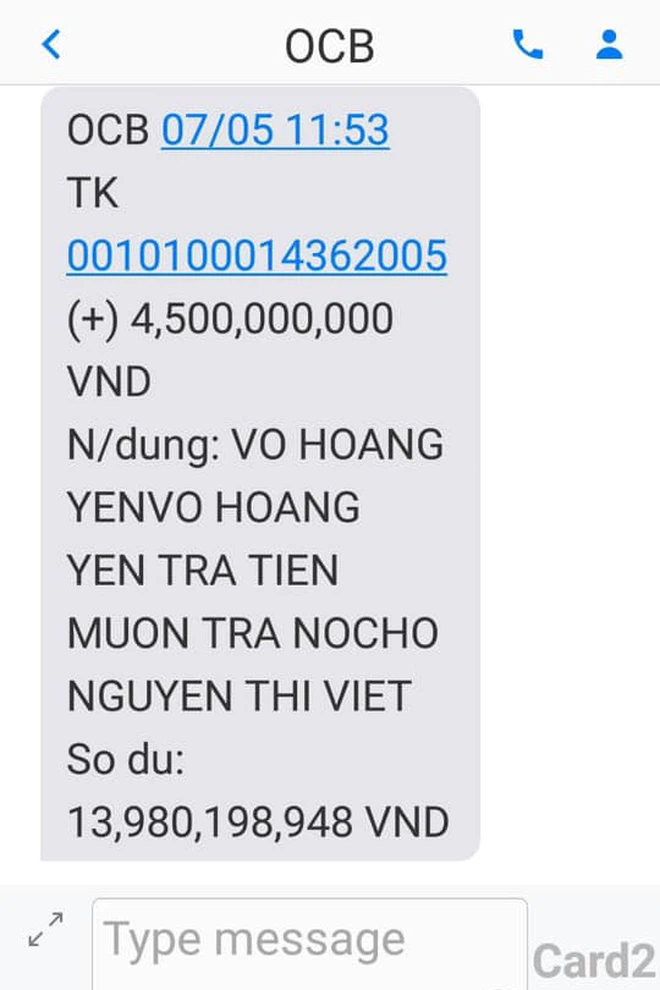 Tin nhắn chuyển tiền với nội dung Võ Hoàng Yên trả tiền mượn chị Hằng 1892019 (Ảnh: FB Nguyen Hoang Nhi)