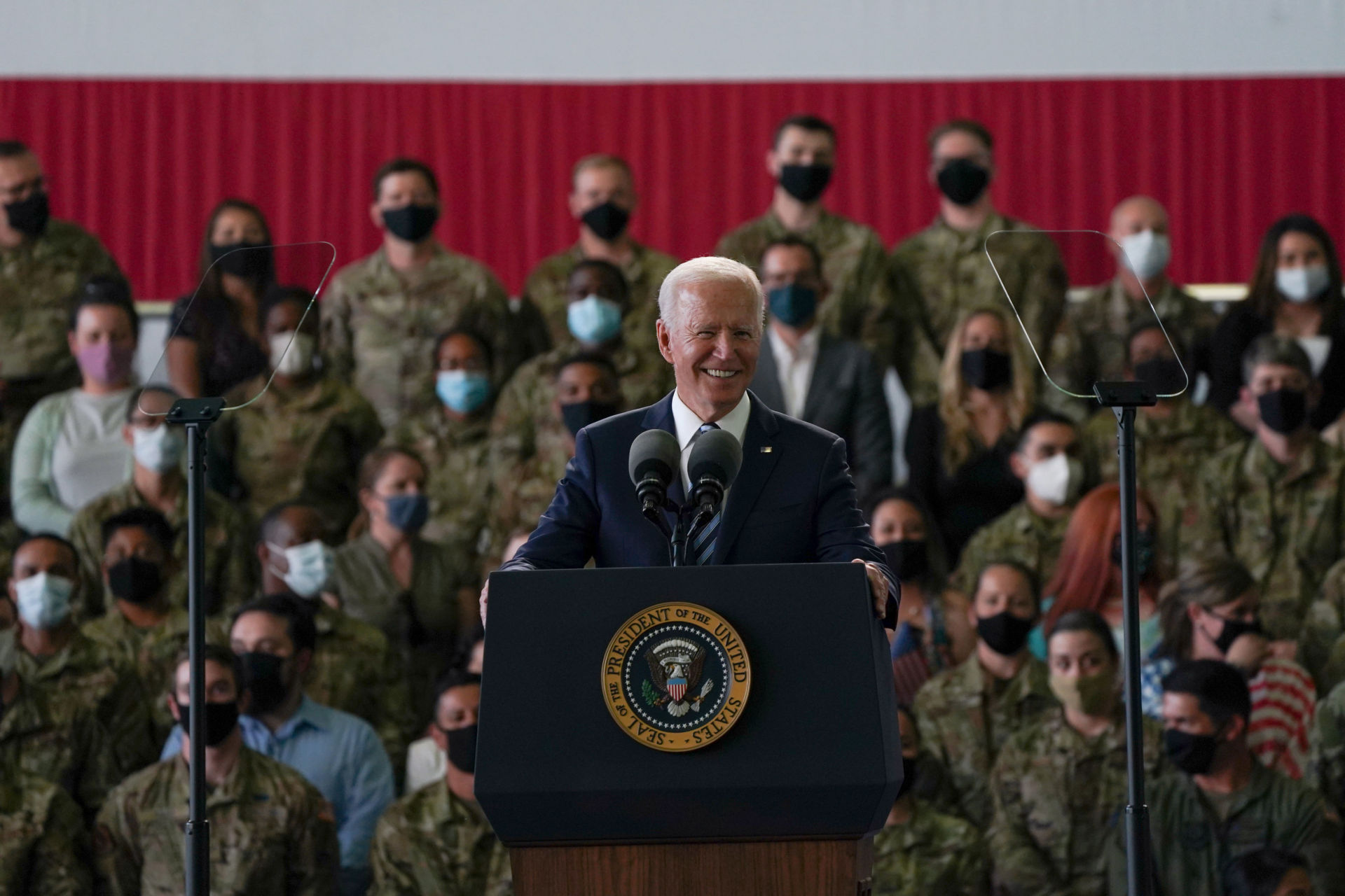 Tổng Thống Joe Biden nói chuyện cùng lực lượng Không Quân Mỹ tại căn cứ RAF Mildenhall, Suffolk, trong chuyến công du Anh Quốc, ngày 11 Tháng Sáu. (Hình: Joe Giddens – WPA Pool/Getty Images)
