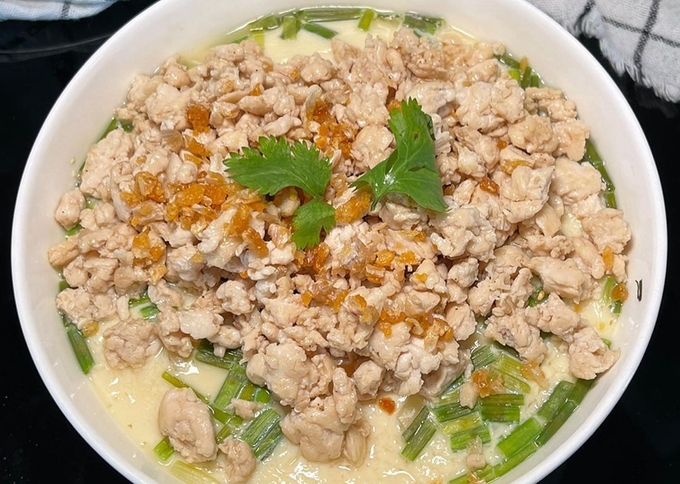 Trứng hấp mềm mịn. Hòa quyện với vị béo thơm. Ăn cùng với thịt heo băm, điểm vài miếng hành lá trở thành món điểm tâm đủ chất.