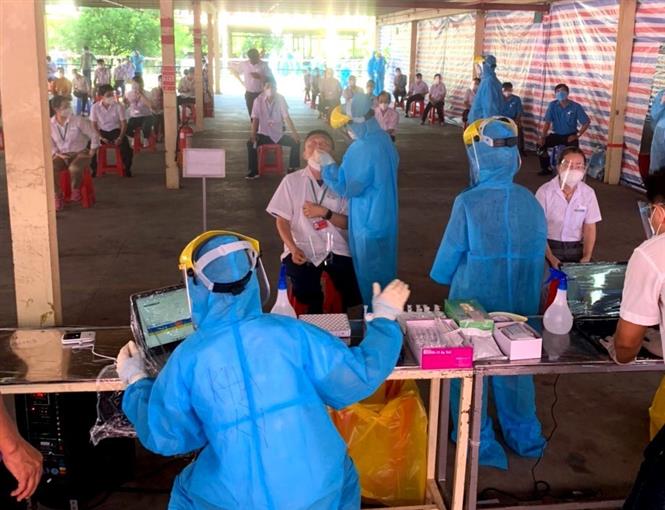 Xét nghiệm test nhanh cho công nhân Khu công nghiệp. Ảnh: TTXVN