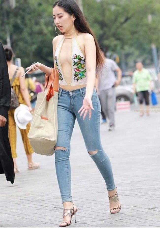 Cô gái này diện chiếc áo quá hở hang vẫn vô tư dạo phố.