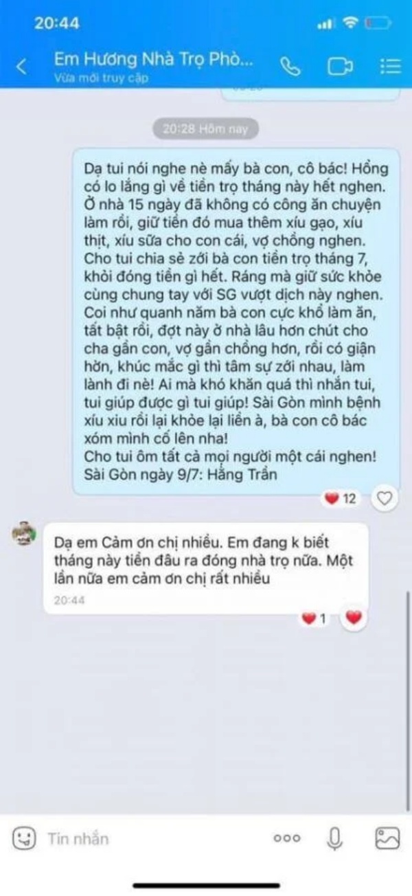 Giữa tâm dịch, chị Hằng thấu hiểu nỗi lo cơm áo gạo tiền của các lao động nghèo từ thập phương đổ về Sài Gòn, thuê phòng trọ ở nhà chị. Chính vì thế, người phụ nữ này hi vọng số tiền miễn giảm cho các phòng sẽ giúp khách trọ có thêm chi phí mua lương thực, yên tâm thực hiện giãn cách xã hội. “Tháng 7 khỏi đóng tiền gì hết”, câu nói ngắn gọn nhưng lại ấm áp tình người.