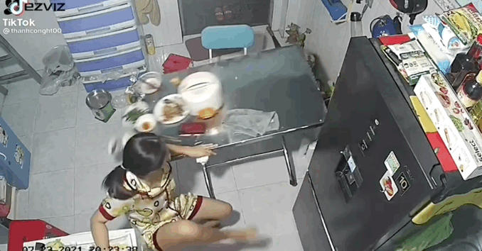 Vậy nên nhớ nha "quý dzị", ăn trên bàn, ngồi trên ghế thì tuyệt đối không gác chân lên ghế kẻo bị mất đà như cô gái trên nhé!