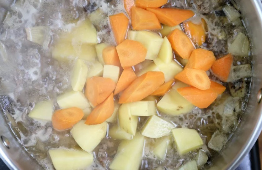 Khi đã loại bỏ bọt và các tạp chất, hãy thêm khoai tây và cà rốt vào nồi đun ở lửa vừa trong 10 phút. Sau đó cho táo vào nồi và đun thêm 5 phút.