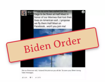 Did the U.S. government fail to lower flags to half-mast in honor of the Marines who lost their lives in the August 2021 bombing at Kabul airport? No, that's not true: The claim was made without supporting evidence and President Joe Biden issued a proclamation ordering the flags to be flown at half-staff on August 26, 2021. Lead Stories staff in Washington confirmed the order had been carried out by observing and photographing lowered flags on federal buildings.