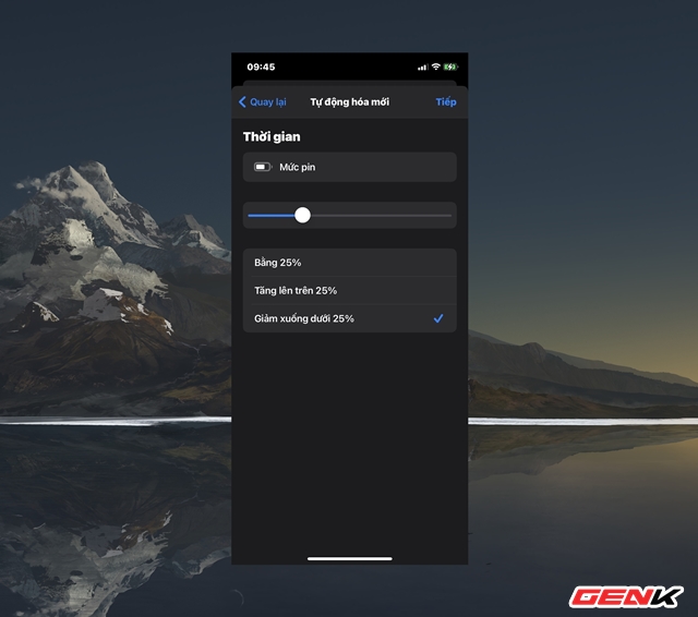 Kéo thanh trượt đến % mình muốn, đồng thời nhấn chọn vào dòng điều kiện bạn muốn ở bên dưới. Sau đó nhấn Tiếp.