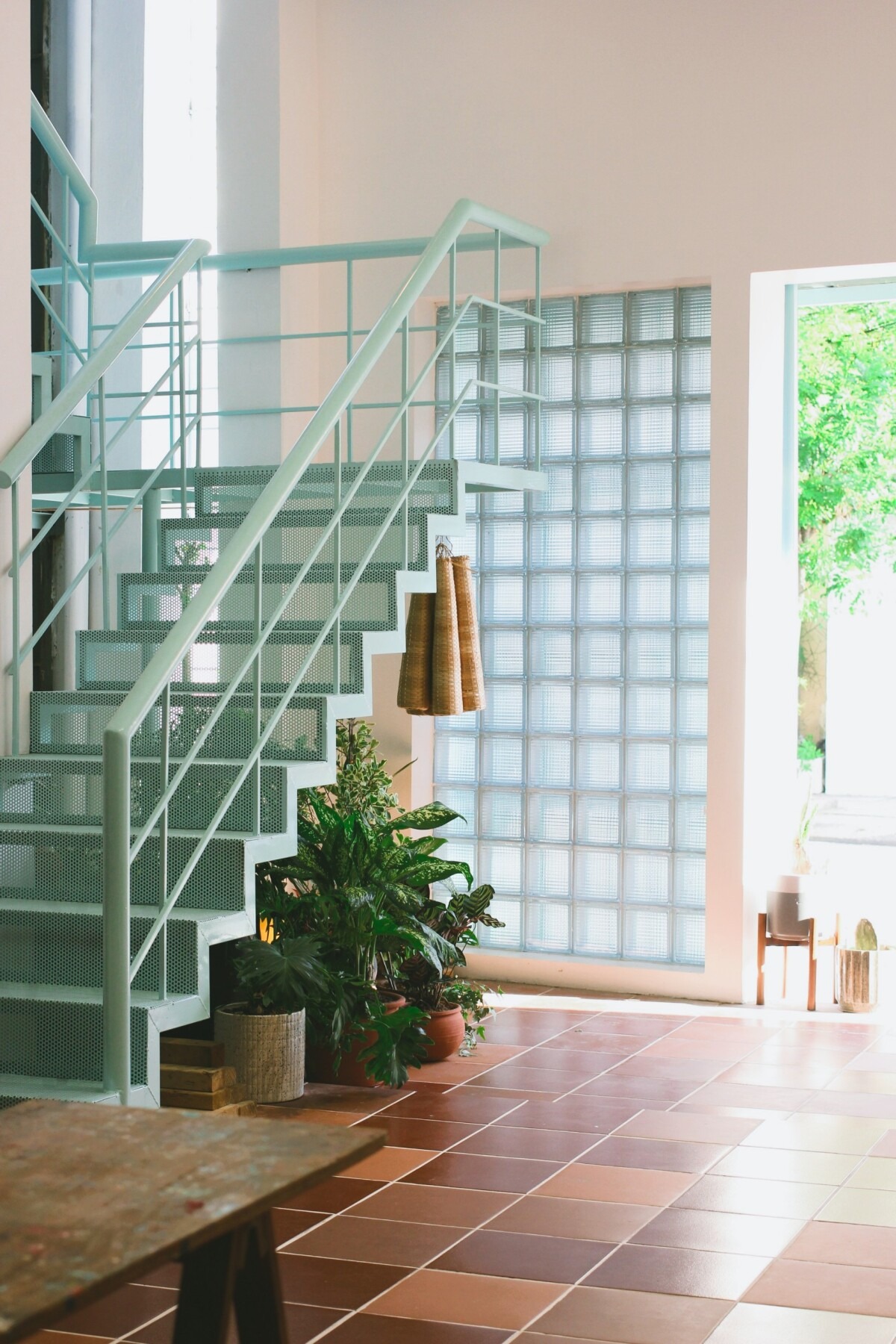 Cầu thang là phần khó cải tạo nhất. Kiến trúc sư quyết định đập bỏ phần ban công phía trên tầng hai. Cầu thang mới nửa ở trong nửa ở ngoài, nối không gian tầng trệt với hành lang bên cạnh.