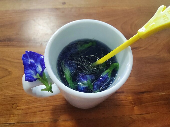 Nước mát gồm: Hoa đậu biếc, rau ngô và một ít đường.