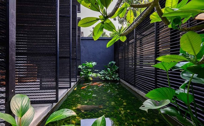 Một hồ cá được thiết kế ở ngay sau cổng nhà, tạo thêm khoảng đệm mát mẻ cho không gian.