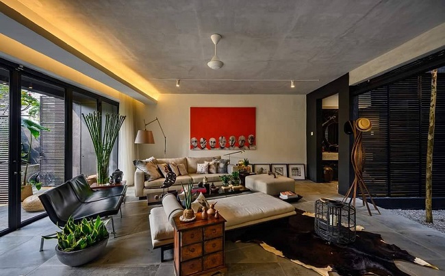 Đằng sau cánh cửa ngôi nhà mở ra một không gian sống vừa sang trọng vừa cá tính. Đơn vị thiết kế sử dụng xen kẽ sàn xi măng trần và tường bê tông sơn sáng màu và sơn đen để ngôi nhà trông không quá tối.