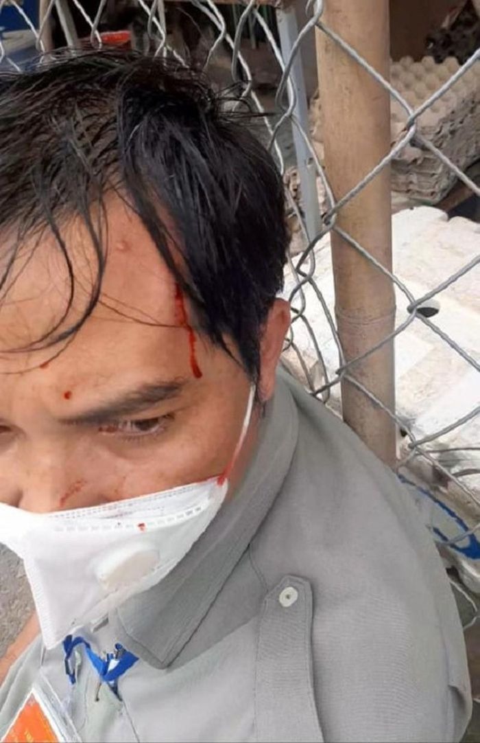 Bảo vệ dân phố ở chốt gác bị ném đá trúng vào đầu. Ảnh: Cắt từ clip