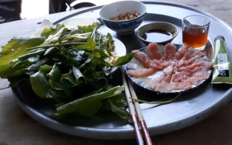 Rau ăn kèm: Lá mơ, lá ổi, diếp cá, rau ngò, lá sung, lá đinh lăng, lá lộc vừng, sung quả…