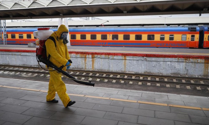 Nhân viên cơ quan tình trạng khẩn cấp Nga khử trùng một nhà ga ở thủ đô Moskva hôm nay. Ảnh: AP.