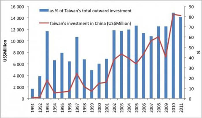 Phải nói là không ở đâu mà sự thịnh vượng lại phụ thuộc nhiều vào Trung Quốc như Đài Loan. Cùng xuất phát điểm nhưng không bị nền kinh tế XHCN phá hoại nên Đài Loan công nghiệp hóa trước lục địa khoảng 25 năm. Do vậy khi Trung Quốc mở cửa đầu những năm 1980 Đài Loan trở thành nhà đầu tư lớn nhất vào đó. Những người cộng sản Trung Quốc đã cúi mọp người đón tư bản Đài Loan vào “bóc lột sức lao động giá rẻ”. Giới chủ Đài Loan không bỏ lỡ cơ hội. Chính nhờ vào sức lao động rẻ của Trung Quốc mà Đài Loan đã tiến vọt thành một quốc gia hậu công nghiệp hùng mạnh. Từ 1993 đến nay, đầu tư của Đài Loan vào TQ luôn nằm ở mức 70-85% tổng giá trị đầu tư của họ ra nước ngoài (xem biểu đồ). Đối với Đài Loan, quan hệ kinh tế với Trung Quốc cực kỳ quan trọng.