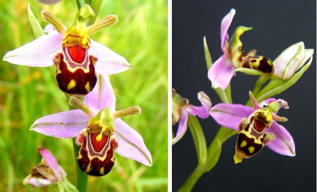 Nếu đã ngạc nhiên với loài lan chim và lan hạc ở trên thì loài lan hình con ong này sẽ làm bạn bất ngờ hơn nữa. Lan ong có tên khoa học là Ophrys apifera, chiều cao khoảng 30 cm, phân bố chủ yếu ở miền nam nước Anh, Ai-len và xứ Wale. Hoa lan hình ong rất dễ nhận dạng bởi mùi hương và màu sắc độc đáo của chúng. Những đài hoa lớn mập mạp, cánh hoa nhỏ màu hồng, viền cánh hoa màu nâu khá nổi bật, giống hệt một bé ong đang cười hồn nhiên.