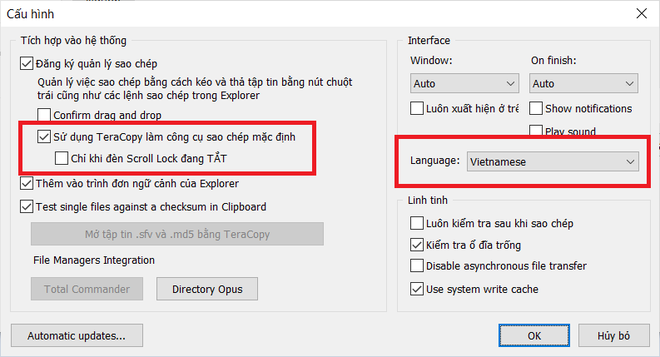 Ngoài ra, tại hộp thoại cài đặt này, bạn đánh dấu vào tùy chọn "Sử dụng TeraCopy làm công cụ sao chép mặc định" rồi nhấn "OK" để lưu lại thiết lập.