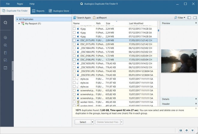 Auslogics Duplicate File Finder là phần mềm miễn phí, được ra đời với tính năng cho phép người dùng quét toàn bộ ổ cứng trên máy tính để tìm và liệt kê những file có nội dung giống nhau, từ đó có thể xóa đi và chỉ giữ lại một file duy nhất trên máy tính. Bạn đọc có thể download phần mềm miễn phí tại đây và tham khảo cách dùng phần mềm đã được Dân trí giới thiệu tại đây.