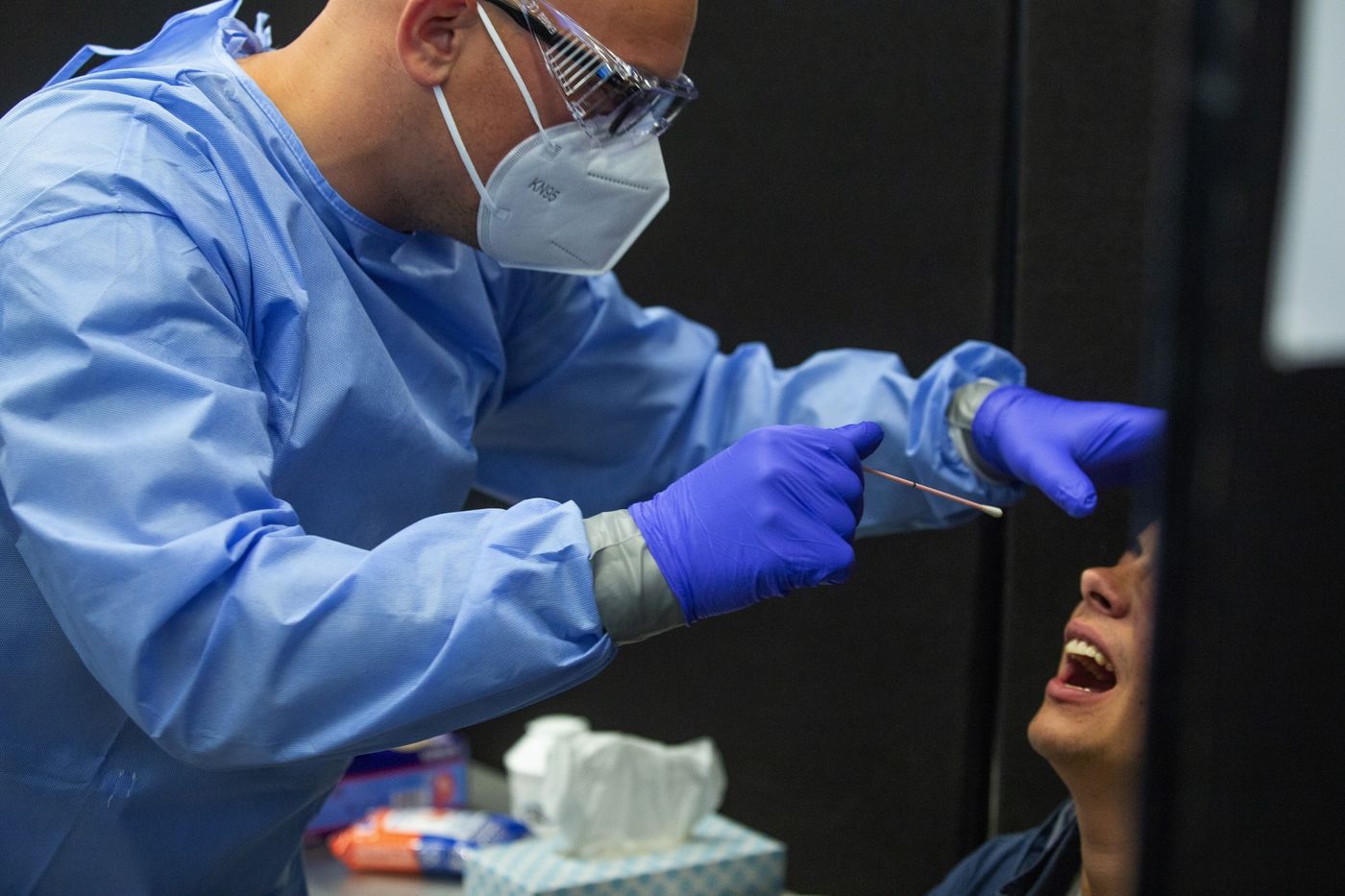 Nhân viên y tế lấy mẫu xét nghiệm COVID-19 cho hành khách tại sân bay Schiphol, Amsterdam. Ảnh: Bloomberg