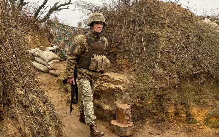 Một lính Ukraine đi dưới chiến hào ở miền Đông nước này. Ảnh: Sky News.