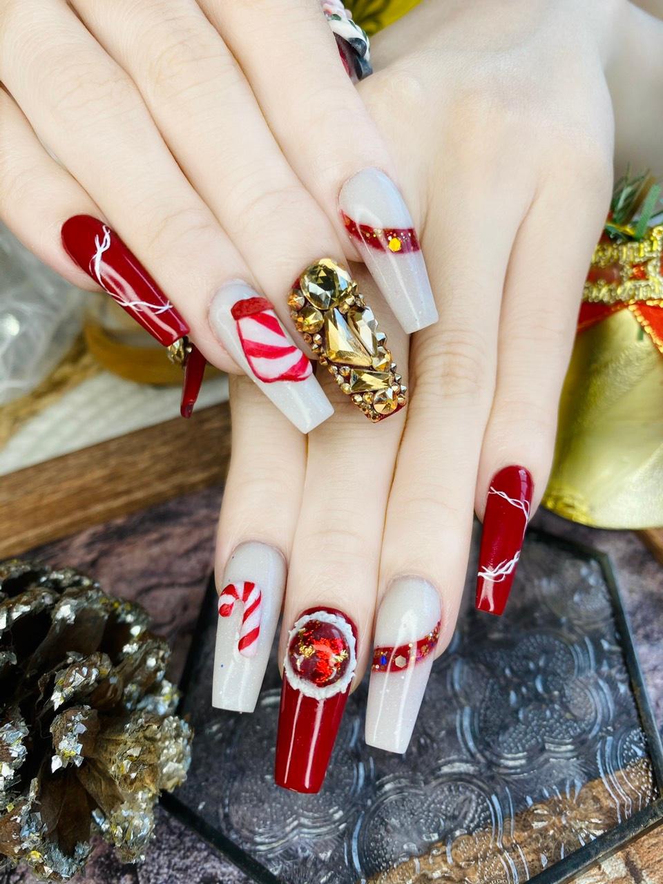 Noel thật sang trọng với tone màu đỏ đô huyền bí kết hợp chút óng ánh kiêu sa. Điểm nhấn của bộ nail này là phần nổi của trái châu, cây kẹo trên nền móng kim tuyến trắng. Diện lên mình chiếc váy đỏ xúng xính chút lớp trang điểm và với bộ nail này sẽ làm bạn thật sự nổi bật.