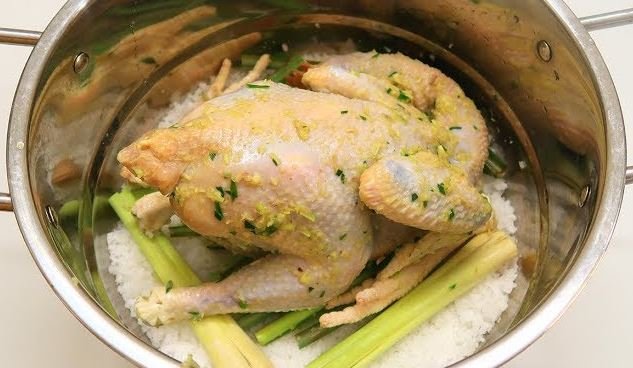Luộc gà dùng muối, sả, lá chanh, rượu
