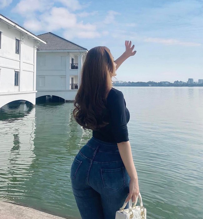 Lê Thị Bích thu hút sự chú ý trên mạng xã hội vì diện quần jean đẹp, tôn đường cong siêu thực ở Hồ Tây (Hà Nội).
