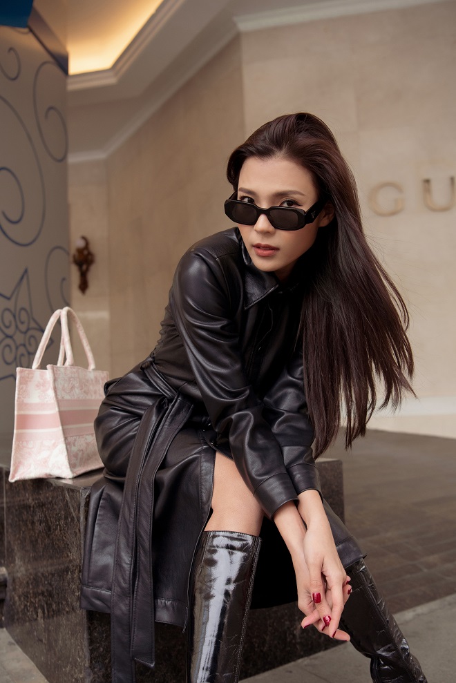 Ở set đồ khác, Thúy Diễm lựa chọn áo da khoác ngoài lựa chọn thiết kế váy da dáng dài quá đầu gối kết hợp thắt lưng tạo điểm nhấn ở vòng 2 nhỏ nhắn. Phối cùng set đồ, cô đi boots đùi cùng màu và chất liệu sang chảnh, thời thượng. Cùng với đó, nữ diễn viên đeo thiết kế kính mắt dáng chữ nhật phù hợp với gương mặt. Thúy Diễm cũng khéo léo kết hợp với túi Dior Book Tote Pink - một trong những mẫu túi đắt hàng nhất nhì của nhà mốt Pháp.