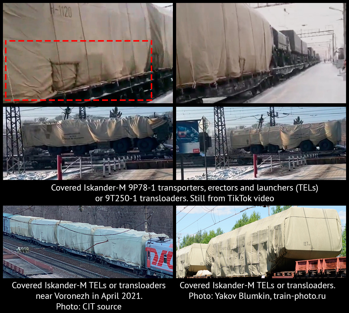 Các nhà quan sát tình báo nguồn mở cũng bị thu hút sự chú ý vào video được đăng tải trên mạng xã hội cho thấy một số đoàn tàu chở một lượng lớn khí tài quân sự của Nga, bao gồm cả hệ thống tên lửa đạn đạo Iskander.