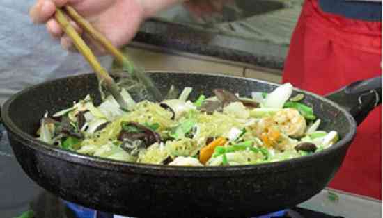 – Lấy chảo khác, cho miến và rồi đập quả trứng vào, đảo xào đều tới khi miến săn lại. Nếu không muốn bày thêm chảo thì bước này cho tất cả nguyên liệu vào đảo đều, nêm nếm vừa ăn thì tắt bếp, trút ra đĩa.