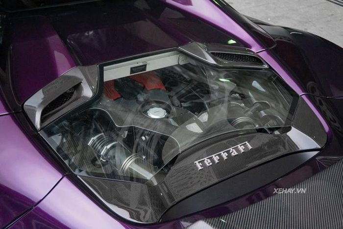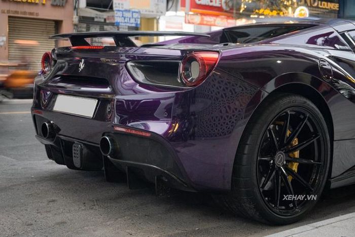 Ngoài việc "thay áo" tím thì chiếc Ferrari 488 Spider mui trần của ông chủ Pharmacity còn được "độ" lại "dàn chân", đổi từ mâm 5 chấu kép sang mâm đa chấu sơn đen bóng, đi kèm vẫn là kẹp phanh màu vàng tương phản.