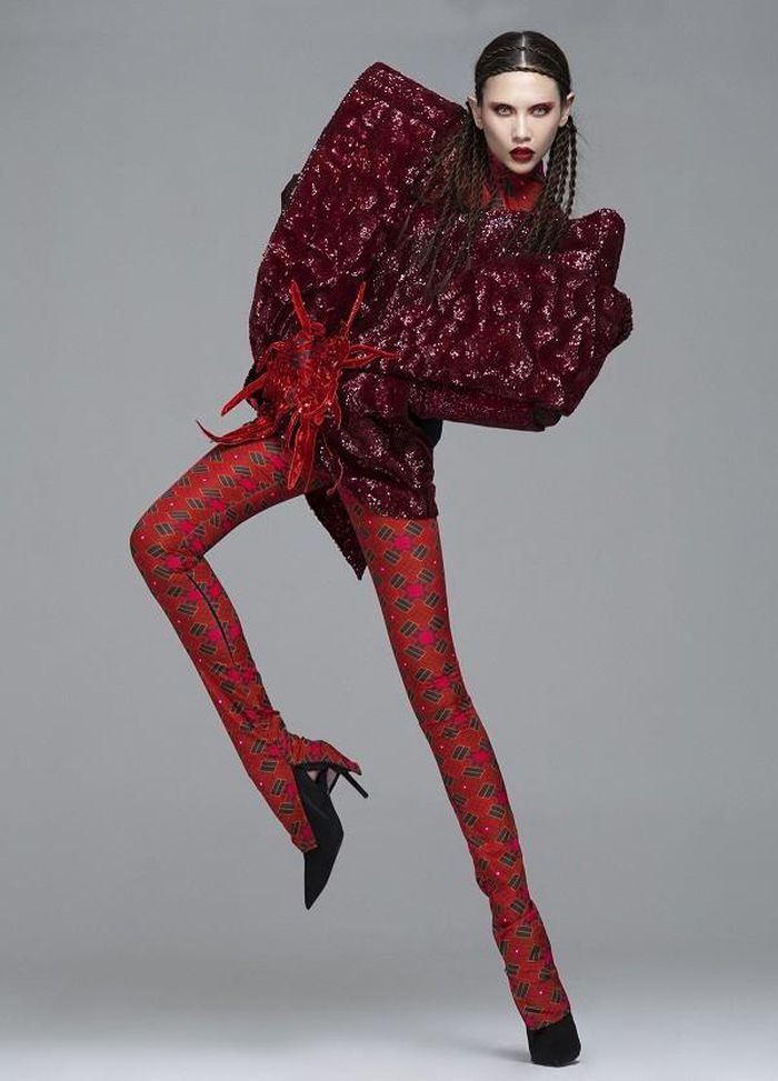 Siêu mẫu thể hiện ngôn ngữ hình thể sống động với set trang phục áo vai thô ánh kim và quần ôm in họa tiết nổi bật.