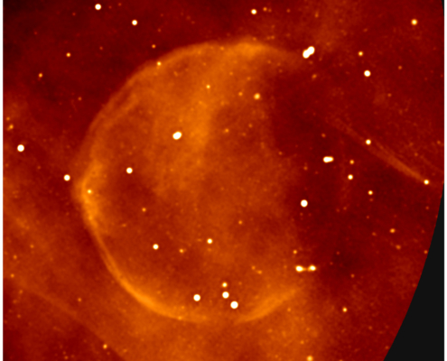 Một tàn tích siêu tân tinh hình cầu cực kỳ hiếm gặp đã được phát hiện ở rìa của bức tranh được chụp bởi MeerKAT. Ảnh: Heywood, SARAO
