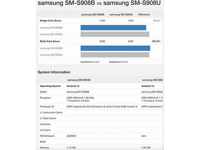Hai phiên bản được so sánh đều là Galaxy S22 Ultra - SM-S908U được cung cấp sức mạnh bởi Exynos 2200 và SM-S908B với chip Snapdragon 8 Gen1. Điểm chuẩn có thể so sánh giữa hai chip. Dễ thấy, phiên bản chạy chip Snapdragon đạt 1168 điểm thấp hơn trong bài kiểm tra lơi đơn trong khi Exynos đạt 1226 điểm. Mặt khác, mẫu Exynos đạt 3462 - thấp hơn một chút so với bản chạy chip Qualcomm -3508 điểm trong bài kiểm tra đa lơi.