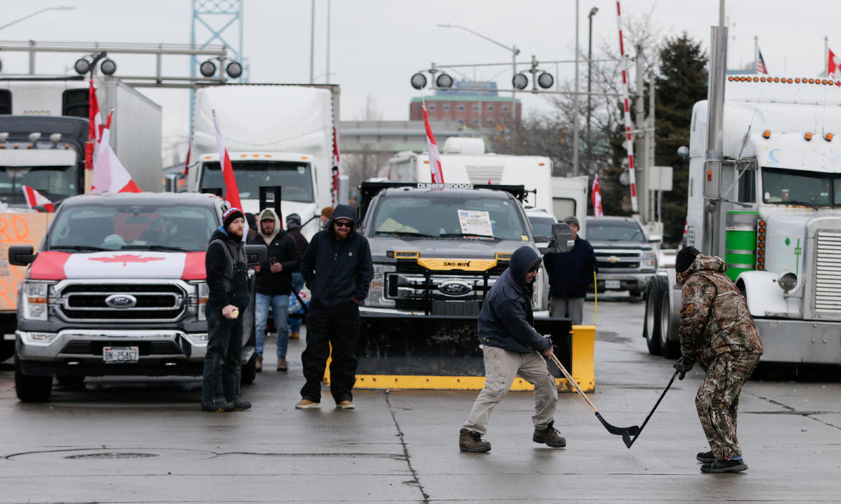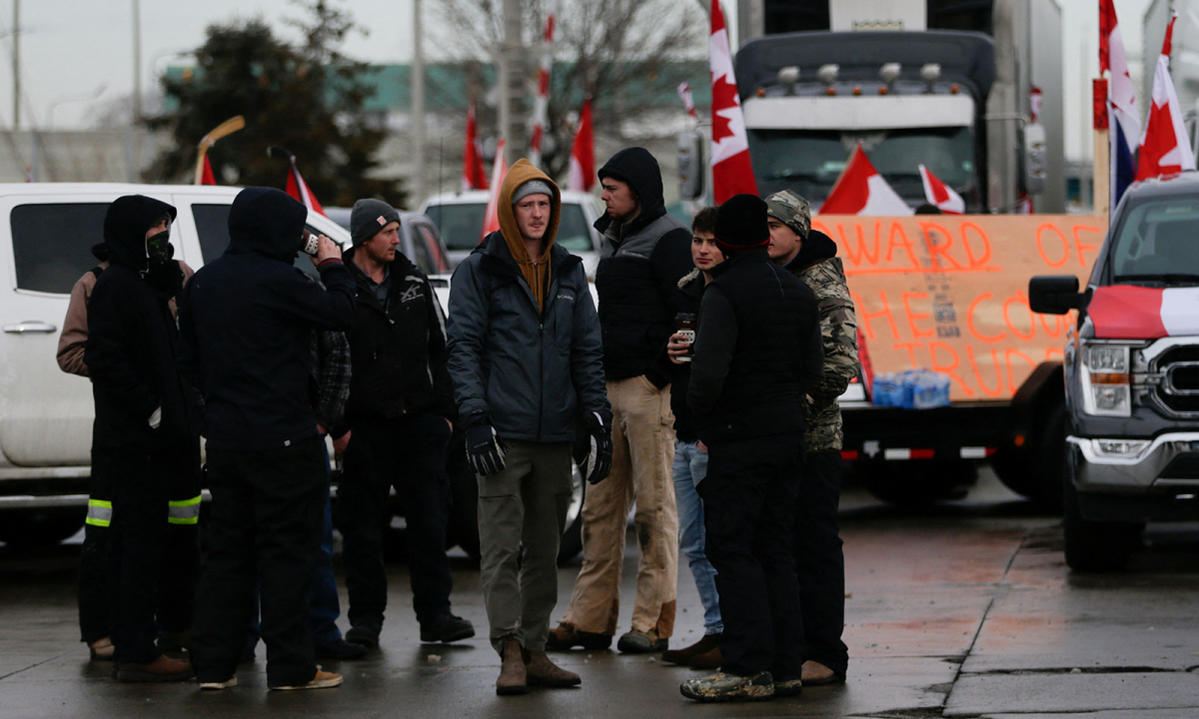 Trong ảnh, người biểu tình đứng trước đoàn xe tải dàn hàng đỗ trên đường, bít lối dẫn lên cầu Ambassador ở Windsor, Canada ngày 9/2.