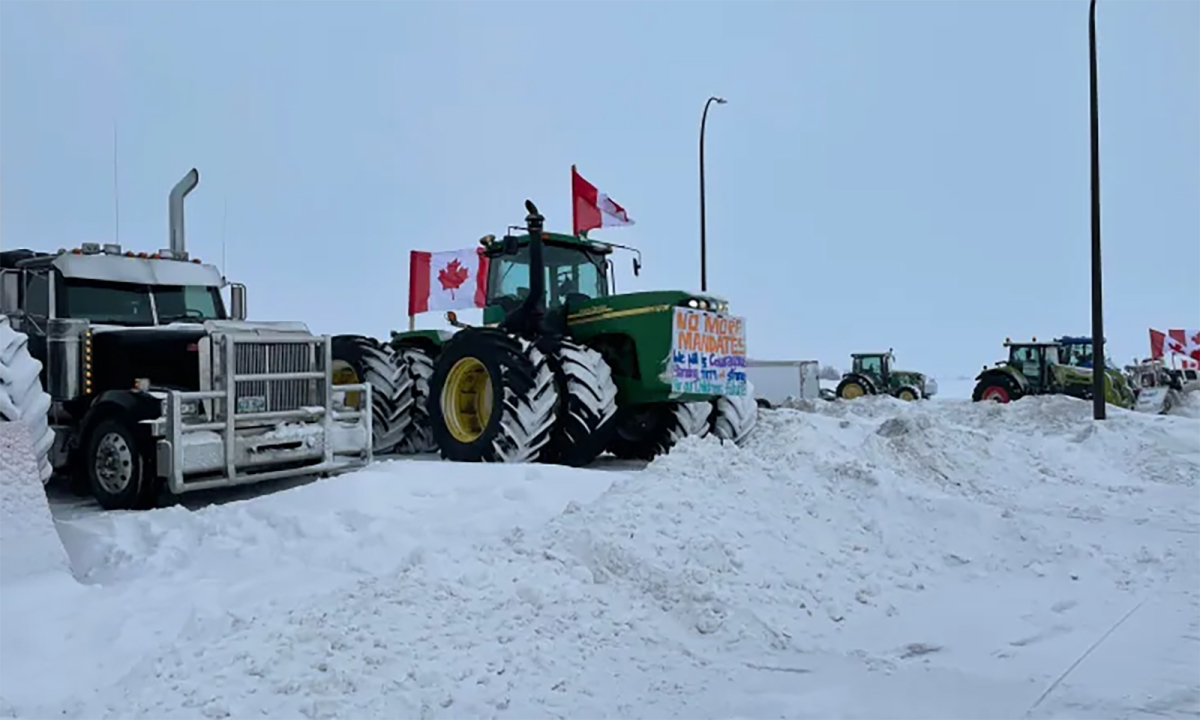 Máy kéo và xe tải tham gia biểu tình chặn đường cao tốc ở Emerson, tỉnh Manitoba, Canada ngày 10/2.