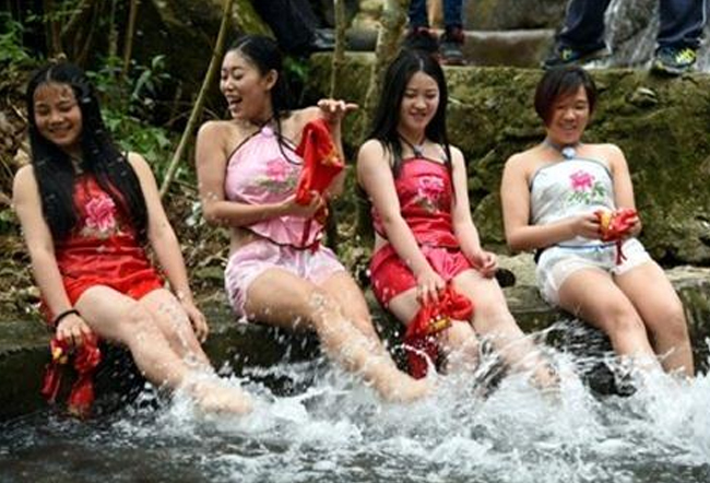 Phiên bản các thiếu nữ mặc yếm tắm suối được một số cô gái dân tộc Choang ở Liên Sơn, Thanh Viễn, Quảng Đông (Trung Quốc) thực hiện ở một khu du lịch nhưng cũng không đánh giá cao. Theo truyền thống của dân tộc Choang, cứ đến tháng 5 hàng năm sẽ diễn ra nghi thức tắm rửa tịnh thân dưới thác nước tự nhiên.