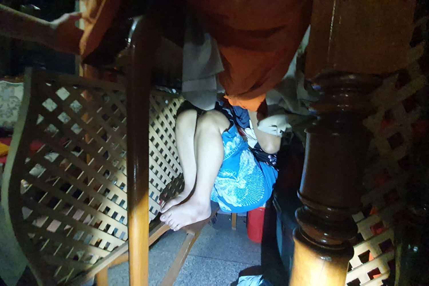 Người phụ nữ run rẩy nấp trong chỗ để áo choàng của sư trụ trì chùa Wat Bang Ya Phraek, Thái Lan tối 9/2. Ảnh: Bangkok Post