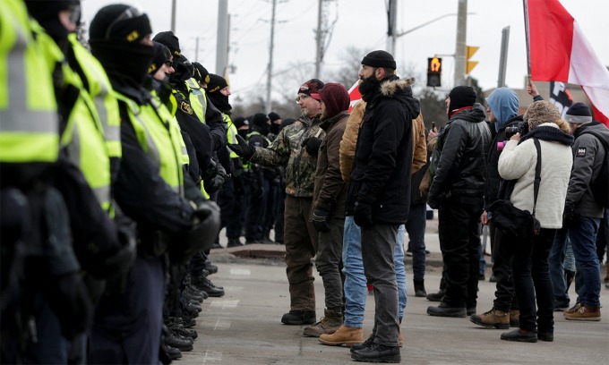 Người biểu tình (bên phải) đứng trước hàng rào cảnh sát Canada tại Ontario ngày 13/2. Ảnh: Reuters.