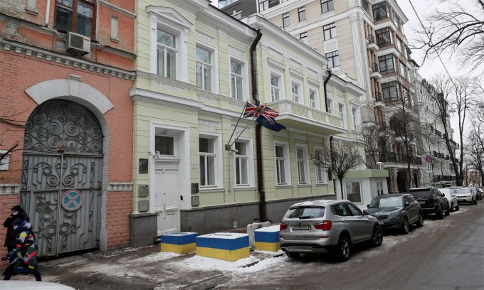 Bên ngoài đại sứ quán Anh tại thủ đô Kiev, Ukraine hồi tháng 1. Ảnh: Sky News.