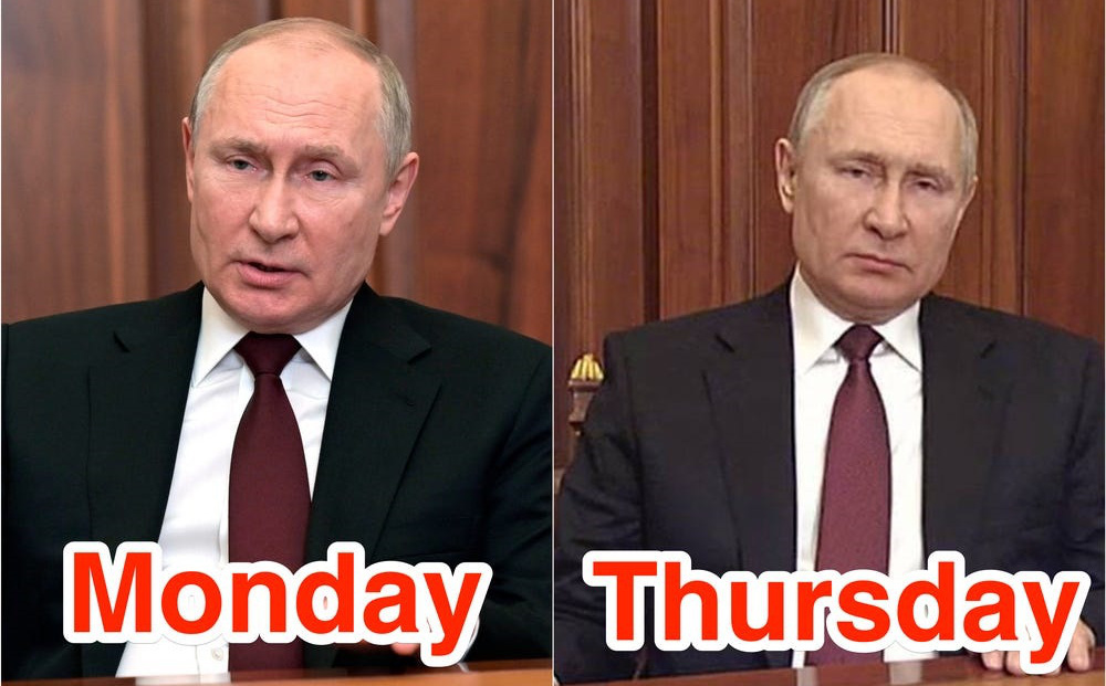 Trang phục và địa điểm tương tự đã làm dấy lên suy đoán rằng tuyên bố về chiến dịch quân sự đặc biệt ngày hôm nay nhằm vào Ukraine đã được ghi hình trước đó.