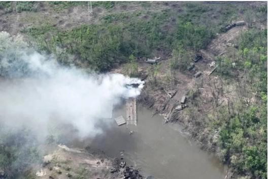 Một bức ảnh chụp từ trên cao cho thấy cây cầu bắc qua sông Seversky Donets, ở miền đông Ukraine, sau một cuộc tấn công vào tháng 5. Ảnh: New York Times.