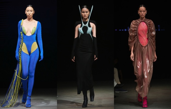 Chắt lọc những chi tiết của áo tứ thân, áo giao lĩnh, nhà thiết kế tạo nên đầm xẻ vai táo bạo dài tới cánh tay, váy lụa xẻ lườn hai bên hông, đầm xếp ly bất đối xứng, đầm lưới tết thủ công, váy liền quần hai trong một. Blazer mang cầu vai độn, giúp người mặc toát lên vẻ quyền lực. Đầm cắt xẻ tô điểm cho vòng một bằng hai miếng ốp hình hạt gạo. Tất cả tạo nên một màn trình diễn của thời trang ứng dụng pha nghệ thuật, hội tụ những kiểu mốt được sàn diễn thế giới ưa chuộng.