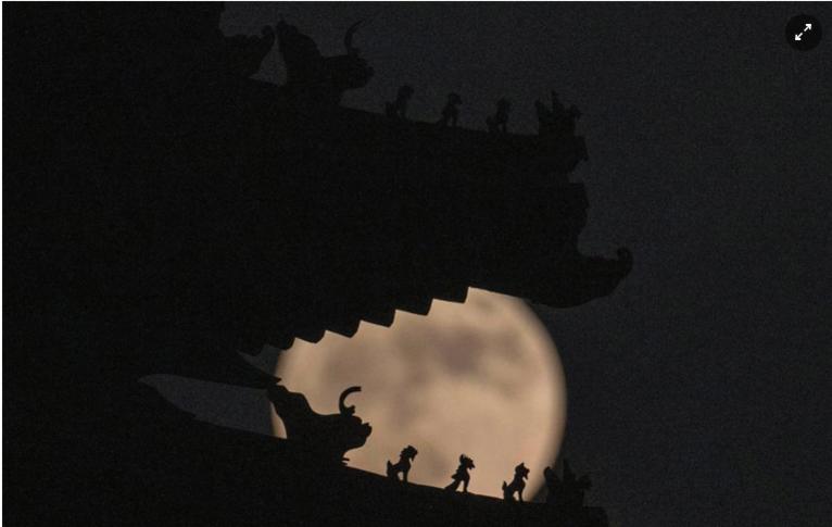 Mặt Trăng đạt cực đại vào hôm 14/6. Hiện tượng này c̣n được gọi là "siêu trăng dâu tây (Strawberry Moon)" v́ Mặt Trăng tṛn vào thời điểm thu hoạch dâu tây ở Mỹ. Trong ảnh, những vật trang trí h́nh những con thú linh thiêng trên mái của Tử Cấm Thành ở Bắc Kinh (Trung Quốc) được in bóng dưới ánh trăng hôm 14/6.